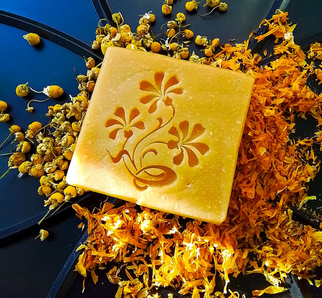 "Calenca" szappanságom - vegán összetételben, 60% elszappanosított olívaolajjal, kamilla-körömvirág olajjos kivonattal és főzettel. Illata hozzáadott illóolaj nélkül halványabb, de határozott édes-kamilla. Színét a körömvirág festékanyaga adja. Érzékeny és általános bőrtípusra, fürdő- és kézmosószappanként ajánlva. "A körömvirág nyugtató, enyhítő és viszketéscsillapító hatásának köszönhetően külsőleg kiegészítő kezeléseknél használatos. A bőrt puhítja, ápolja és lassítja a bőröregedést. Fertőtlenítő és gyulladásgátló, valamint sebgyógyulást elősegítő tulajdonságai miatt bőr- és szájüregi betegségek kezelésére ajánlott. Használják bőrrepedések, kisebb sérülések, pl. vágás, horzsolás, rovarcsípések és napsugárzás okozta bőrgyulladás esetén, valamint égési sérülések, forrázás, nehezen gyógyuló sebek, véraláfutás, bőrelváltozások, például pattanások és ekcéma gyógyítására is." A kamilla köztudottan nyugtató, sebgyógyító, gyulladáscsökkentő összetevő, mely bármilyen bőrtípusra eredményesen használható. "Külsőleg pattanás, tályog, égés, vágás, nehezen gyógyuló sebek, körömágygyulladás, lábszárfekély és ízületi gyulladás kezelhető vele, de enyhíti a bőr szárazságát, viszketését, vörösségét is. Fertőtlenítő, fájdalomcsillapító hatású, növeli az erek rugalmasságát, csökkenti a bőrirritációt és az ekcémás tüneteket. Hajápolóként a hajat fényesíti, világosítja, a fejbőrt nyugtatja " Összetevők: elszappanosított kókuszolaj, olívaolaj, kamilla - körömvirág kivonat, nátrium laktát, glicerin* *a szappanosodás során természetes úton keletkezik Ingredients: saponified coconut oil, olive oil, chamomile - calendula extract, sodium lactate, glycerin * * occurs naturally during saponification
