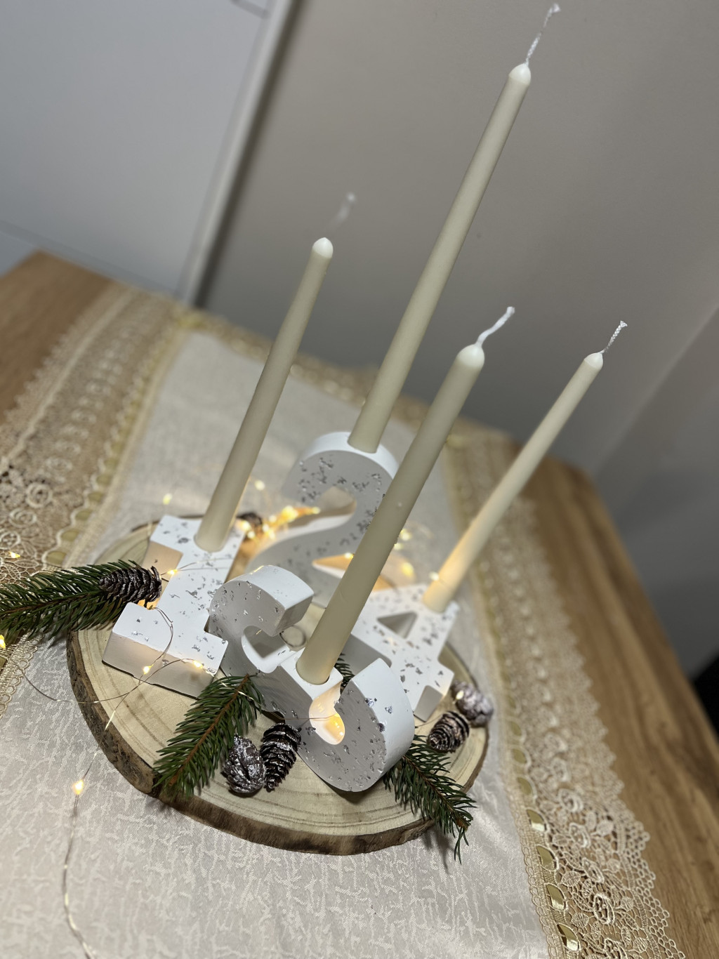 A csomag tartalma: 1,2,3,4 gyertya tartók 4 db illatmentes gyertya opcionálisan illattal is kérhetők a gyertyák ( ezt jelezd kommentben ) így 500 ft-tal drágább a fa korong és a zöldek nem részei az alap dekorációnak.
