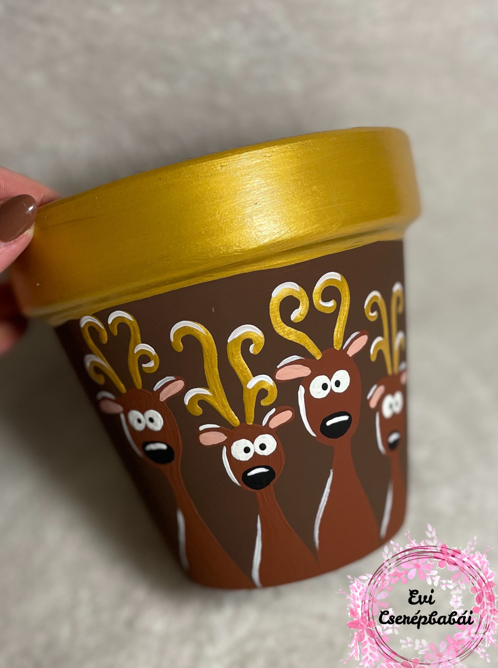 Kézzel festett rénszarvasos agyagcserép. Közepébe virágot is lehet ültetni, vagy csokit, egyéb ajándékot tenni.