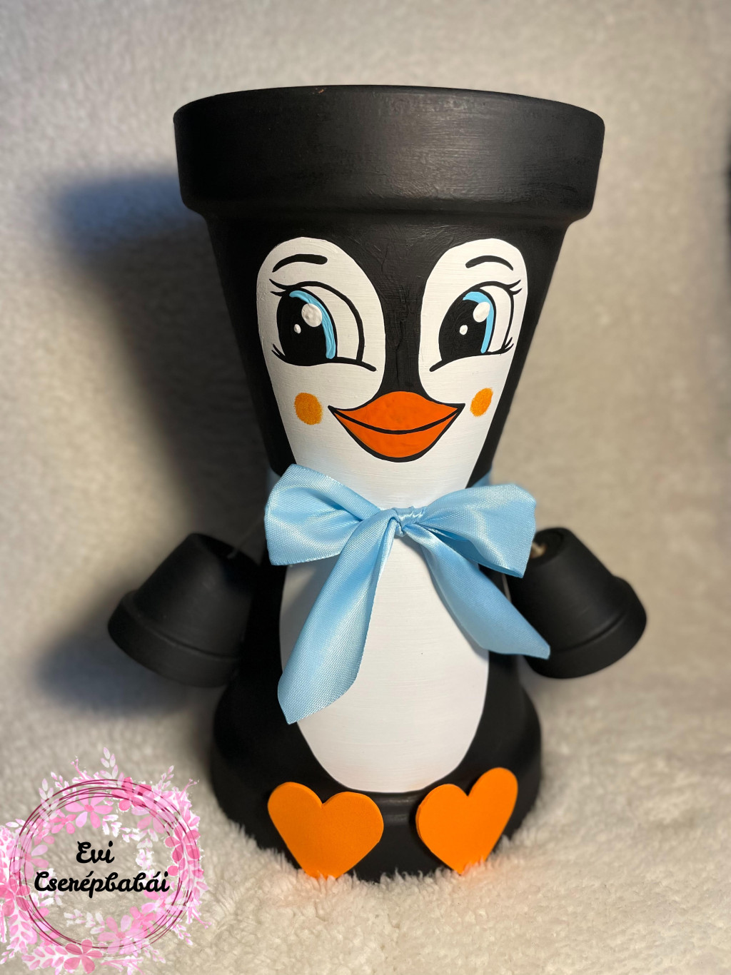 27cm magas, agyagcserépből készült pingvines cserépbaba. Tetejébe rakható növény is vagy akár édesség.