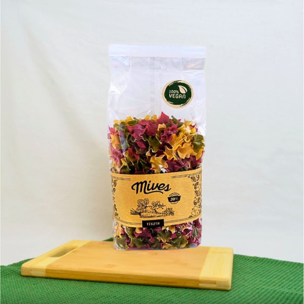 Nagyon magas zöldség tartalom. Durum liszt, zöldség és semmi más. Különleges, pihentetett, kíméletesen szárított, főtt zöldség hozzáadásával, tojás nélküli, kézzel csomagolt, durum száraztészta. 30% zöldségtartalommal - spenót, sárgarépa, paradicsom-cékla vegyesen. Enyhén sós forrásban lévő vízbe öntsük bele a tésztát. Néha kevergessük meg. A tészta vastagságától függően 1-2 percig főzzük. Különleges: A magas minőségű liszt, a nyers zöldségek, a kíméletesség, a gondosság, a türelem, a nagyrészben kézzel végzett munkafolyamatok, a válogatás, a klasszikus és a fejlett tésztaipari technológiák megfelelő összhangja teszi egyedivé és különlegessé a tésztáikat. Főtt zöldséggel: A nyers zöldséget megfőzzük, leszűrjük, majd összeturmixoljuk. Így pürésítve adagoljuk dagasztás közben a liszthez. A zöldség rostja keveredve a liszttel, más állagú - kicsit könnyedebb - durum tésztát eredményez. Bronz formával készült: A dagasztott pihentetett alapanyag formázása bronz eszközzel történik. Ezáltal a felület érdesebb, rusztikusabb lesz, a tészta felülete pedig 'megnő' és jelentősen jobban tudja a mártást felvenni. A mártás nem csúszik le a tésztáról. Pihentetett: A pürésített zöldséggel összedolgozott, dagasztott tészta minősége és szerkezete jelentősen megváltozik egy rövid kis pihenőtől, a formázás előtt. A liszt szemeknek van idejük megduzzadni. Így a formázáskor könnyebben alakul ki a tészta megfelelő sikér szerkezete. Kíméletesen szárított: Minél lassabban és minél szabályozottabb hőmérsékleten és páratartalmon szárítják a tésztákat, azok annál rugalmasabbak és a külső hatásoknak ellenállóbbak lesznek.Tojás nélküli: A kiváló minőségű durum lisztnek magasabb és jobb minőségű a sikértartalma, mint az átlag 'puha' búzának. Ezért nem szükséges hozzáadott ’ragasztó’ tojás a készítéséhez, anélkül is kiváló minőségű a tészta. Kézzel válogatott, csomagolt: A tésztáink nagy részét kézzel vágjuk és válogatják. Ennek célja, hogy a tasakokba a hosszú, ép és egész szálak kerüljenek. Gyártó: Míves Manufaktúra Kft , Göd