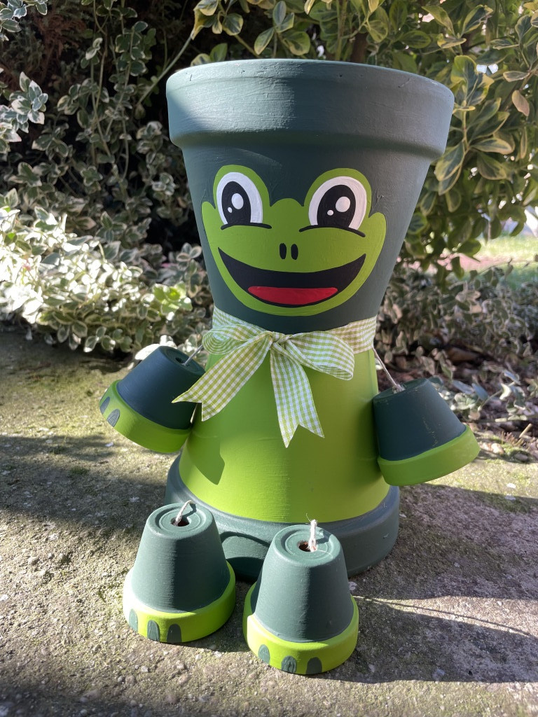 27cm magas agyagcserépből készült békás cserépbaba, a tetejébe virág is ültethető.