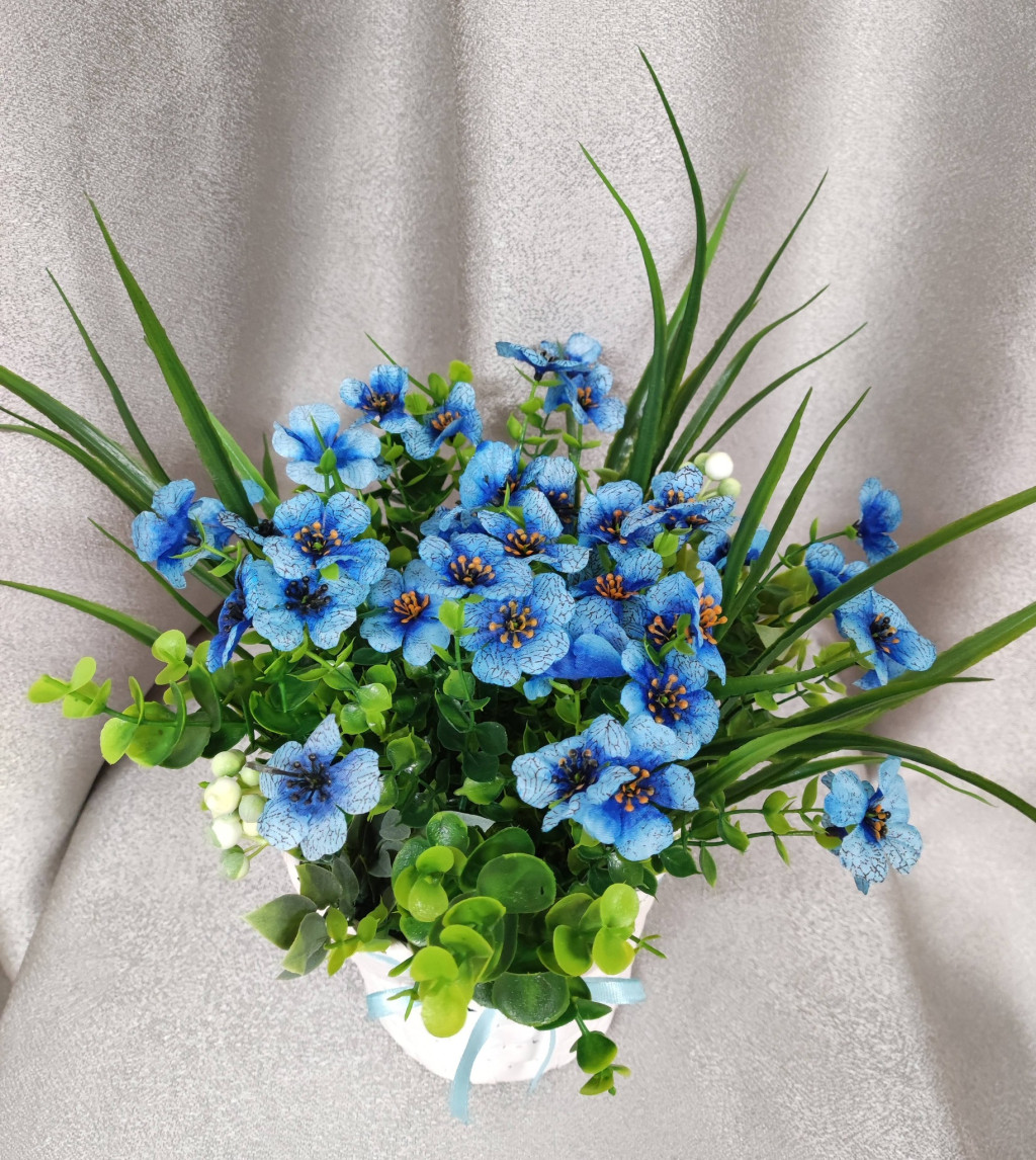 Ez a kék Angyalfüzér egy bájos, kézzel készített virágkompozíció, amely természetes bambusz kaspóban található, és azonnal otthonossá varázsolja bármelyik teret.