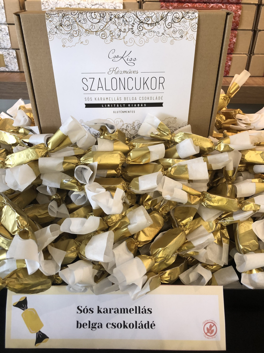 Díjnyertes kézműves sós karamellás szaloncukor, krémesen lágy belga tejcsokoládé krémmel. Celofános csomagolásban, 100g