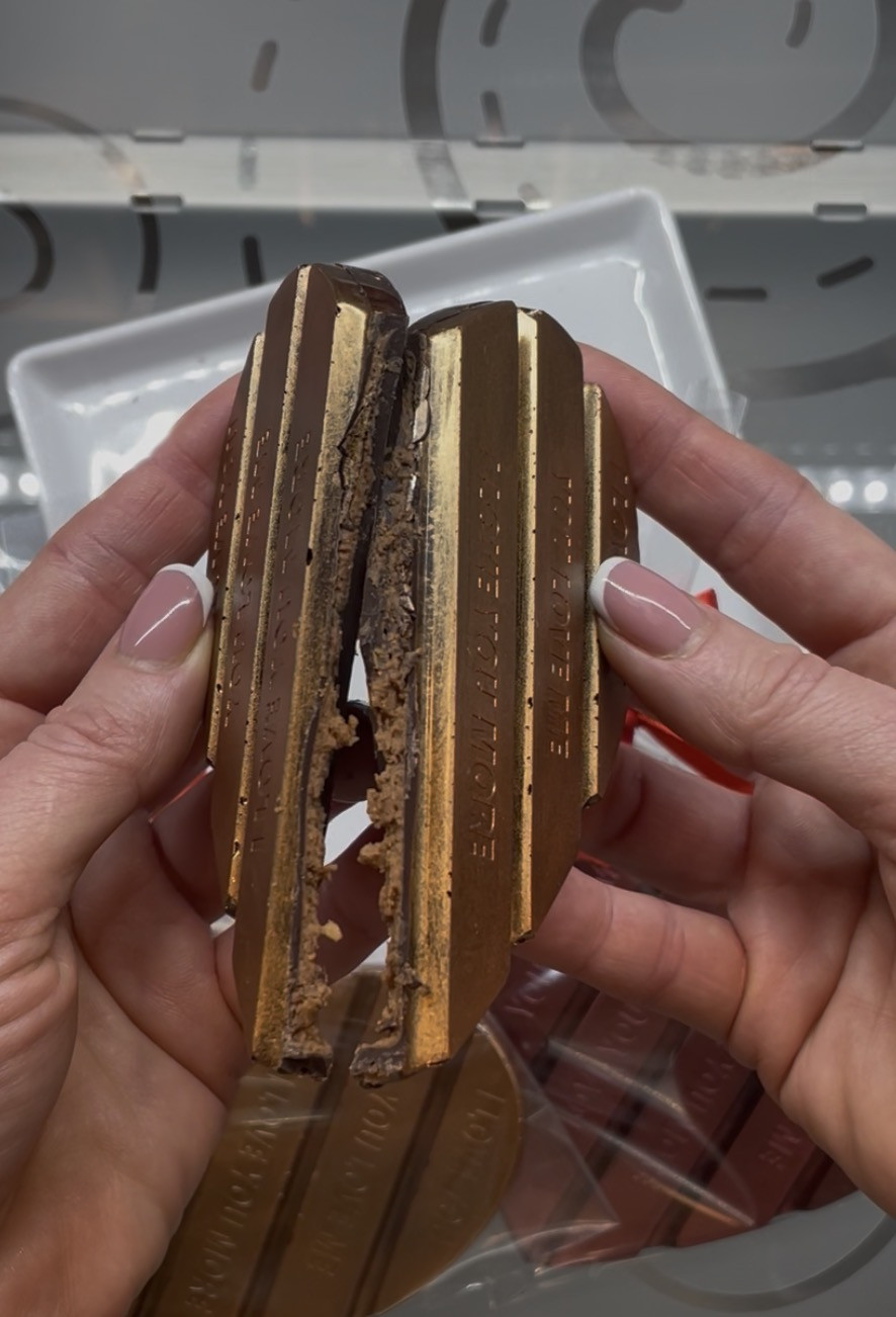 Kézműves, szív alakú csokoládétábla több rétegben, elegáns „LOVE” felirattal.