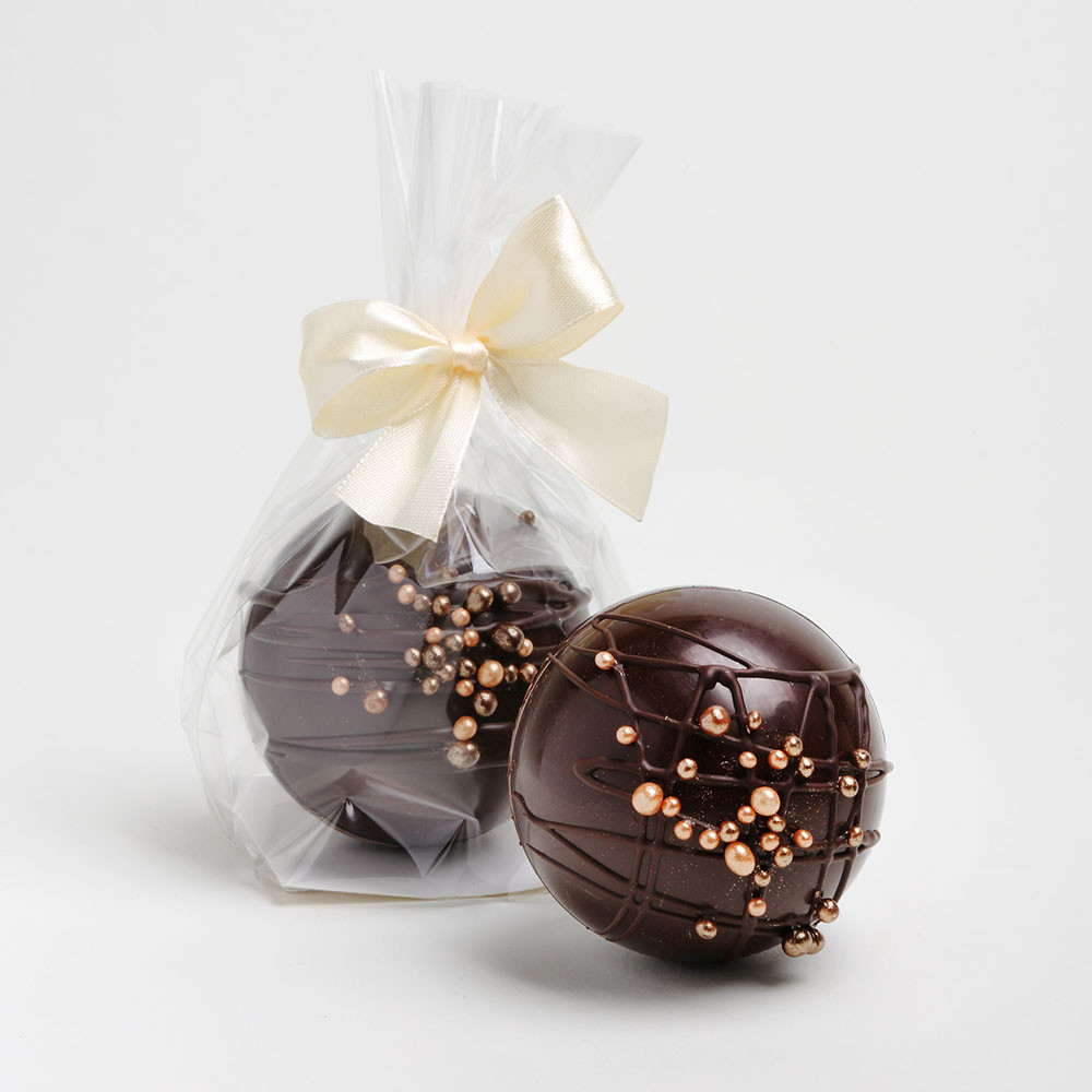 Kézműves belga étcsokoládé gömb, ropogós ostyagolyókkal díszítve, pillecukorral töltve. Elkészítés: Tegye a gömböt egy bögrébe, öntsön rá 1,5-2dl forró tejet, majd alaposan keverje össze a csokoládé feloldódásáig. Elkészítése látványos móka, fogyasztása mennyei érzés! Nyáron jéggel is kitűnő ital!