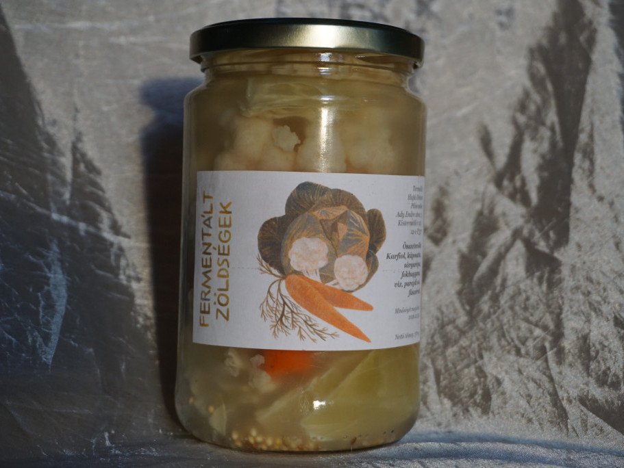 VEGYSZERMENTES ZÖLDSÉGEK FERMENTÁLVA = VITAMINBOMBA. SOK KARFIOL VAN BENNE, MERT MI AZT SZERETJÜK, MEG KÁPOSZTA, FOKHAGYMA, SÁRGARÉPA, FŰSZEREK. EZEN KÍVÜL CSAK VÍZ ÉS PARAJDI SÓ.