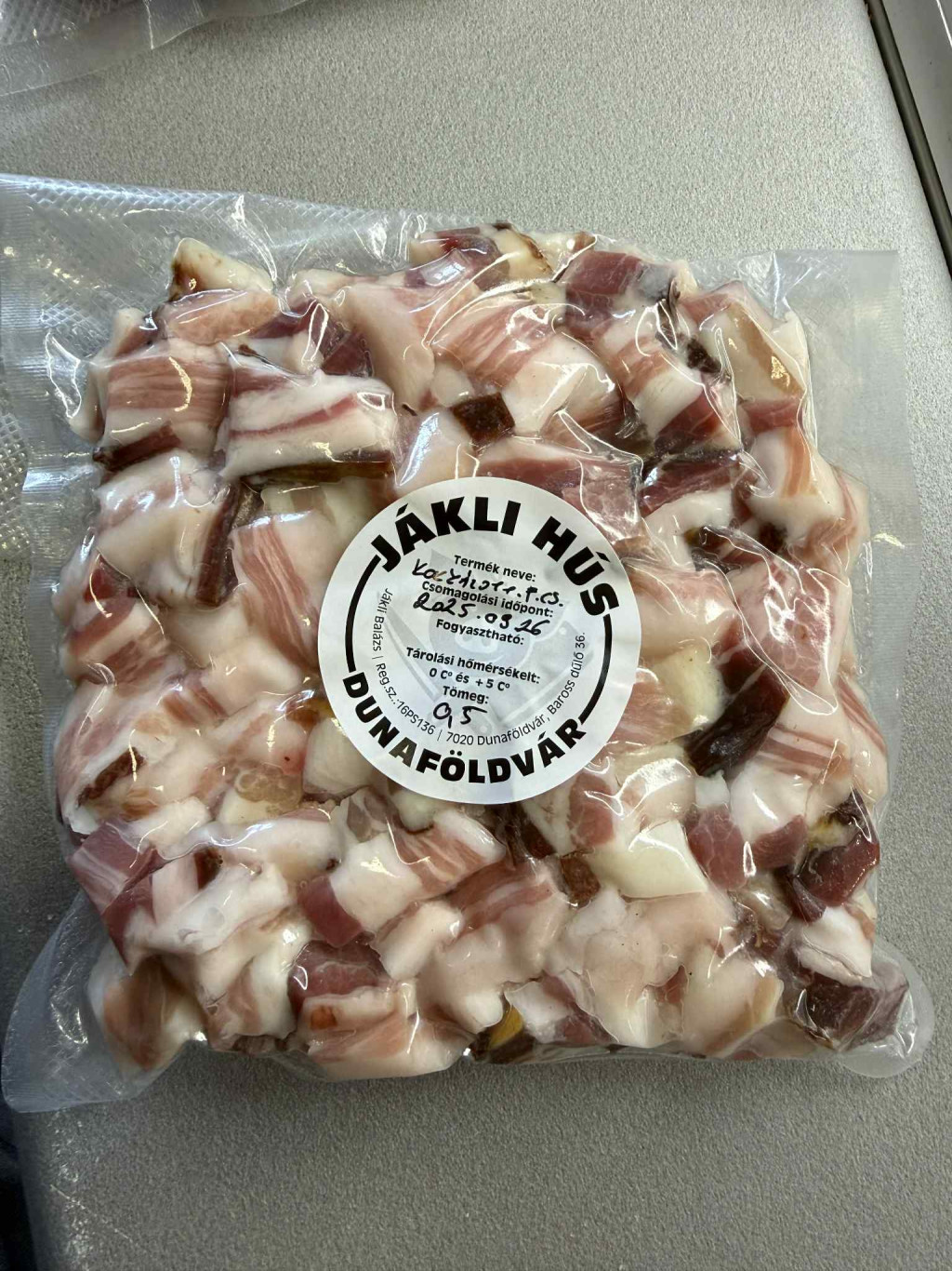 Konyhakész: Bőr nélkül, kockázva. Másnéven, kolozsvári szalonna. Ez az ízletes húsrész, a sertés bordáinál helyezkedik el. Hagyományos módszerrel készül: A friss húst három hétre sóra tesszük, és utána száraz fűrészporral/forgáccsal három napig füstön tartjuk. Így nyeri el végső ízét, és tartósságát. Saját magunk tenyésztjük a sertéseket Dunaföldváron, és mi termeljük meg a takarmányt is Dunaföldvár határában. Igyekszünk, hogy minél kisebb ökológiai lábnyommal kerüljenek a termékeink, a fogyasztók asztalára. A csomagolásnál nem lehetséges pontos kg-ot porciózni, ezért az átvételkor előfordulhatnak minimális eltérések a rendelt mennyiséghez képest.